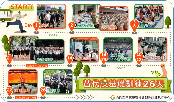 114年度基礎訓練期程為26天,課程規劃區分為「重大期程及一般課程」、「役政專業課程」、「志願服務課程」、「自衛防護訓練」、「緊急救護訓練」及「學術實務課程」等6個單元:
