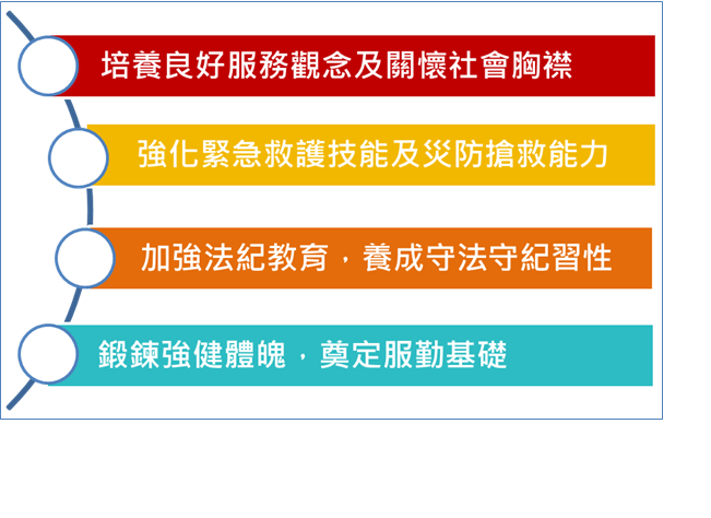 替代役基礎訓練主要訓練⽬標有四項:「培養良好服務觀念及關懷社會胸襟」、「強化緊急救護技能及災防搶救能力」、「加強法紀教育,養成守法守紀習性」、「鍛鍊強健體魄,奠定服勤基 礎」。