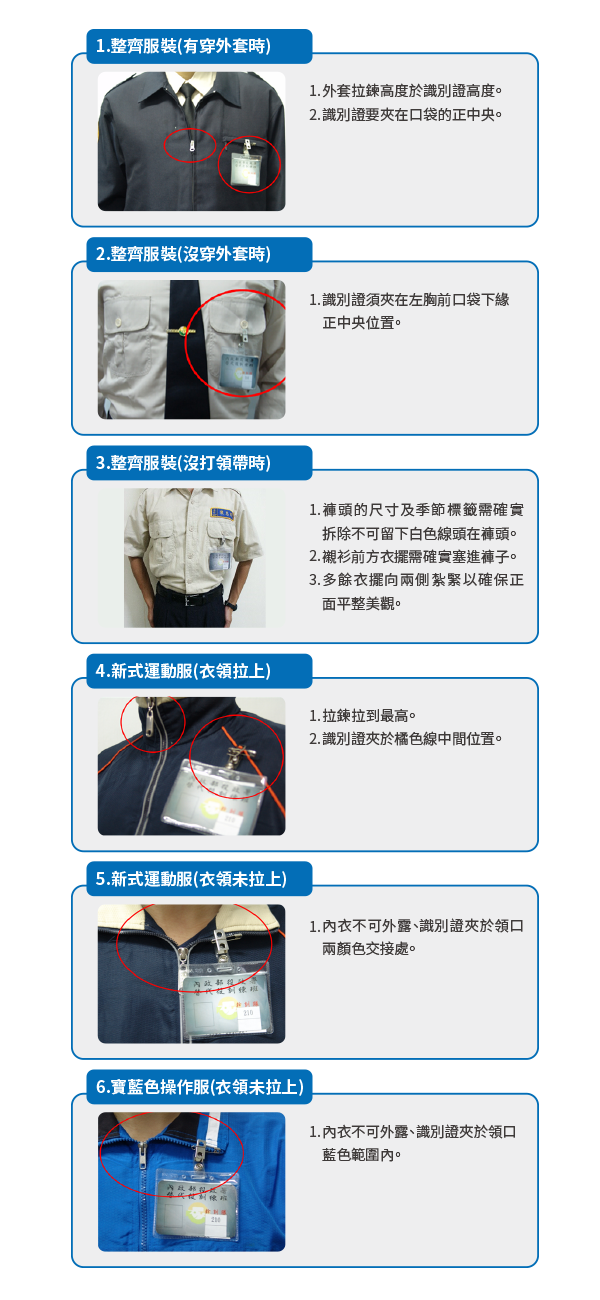 生活管理 服裝著裝要領 應依個人型號領用,大小必須合身,不合身者必須立即更換。 人員著制服時,室內須脫帽,室外需戴帽。 姓名布條繡於制服左側上衣口袋上方。 在營區內須將識別證掛於上衣左側口袋處,外出時則取下放妥。 服裝內以著白內衣為主,如著不同顏色者,以不露出衣物為原則。 天氣寒冷由大隊值星官統一規定穿著夾克。 生活管理-示範服裝區