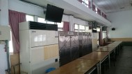 當每次用餐完畢進行餐具清洗時,各中隊有專屬的過水清洗區,並於每大餐廳配設1台自動化洗碗機台,以加強洗淨餐具,每1中隊皆有配置專用的餐具消毒櫃於餐具清洗後以再高溫消毒,以維護團膳伙食之衛生安全。